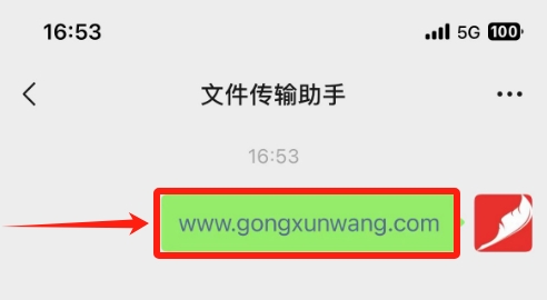 1.微信任意聊天页面输入官方网址www.gongxunwang.com,发送后,点击网址链接,即可打开。